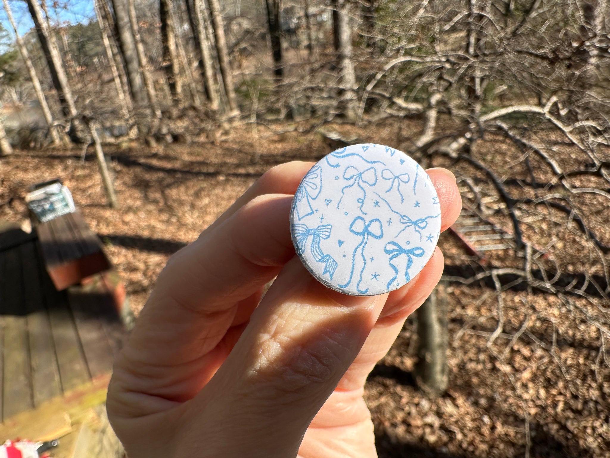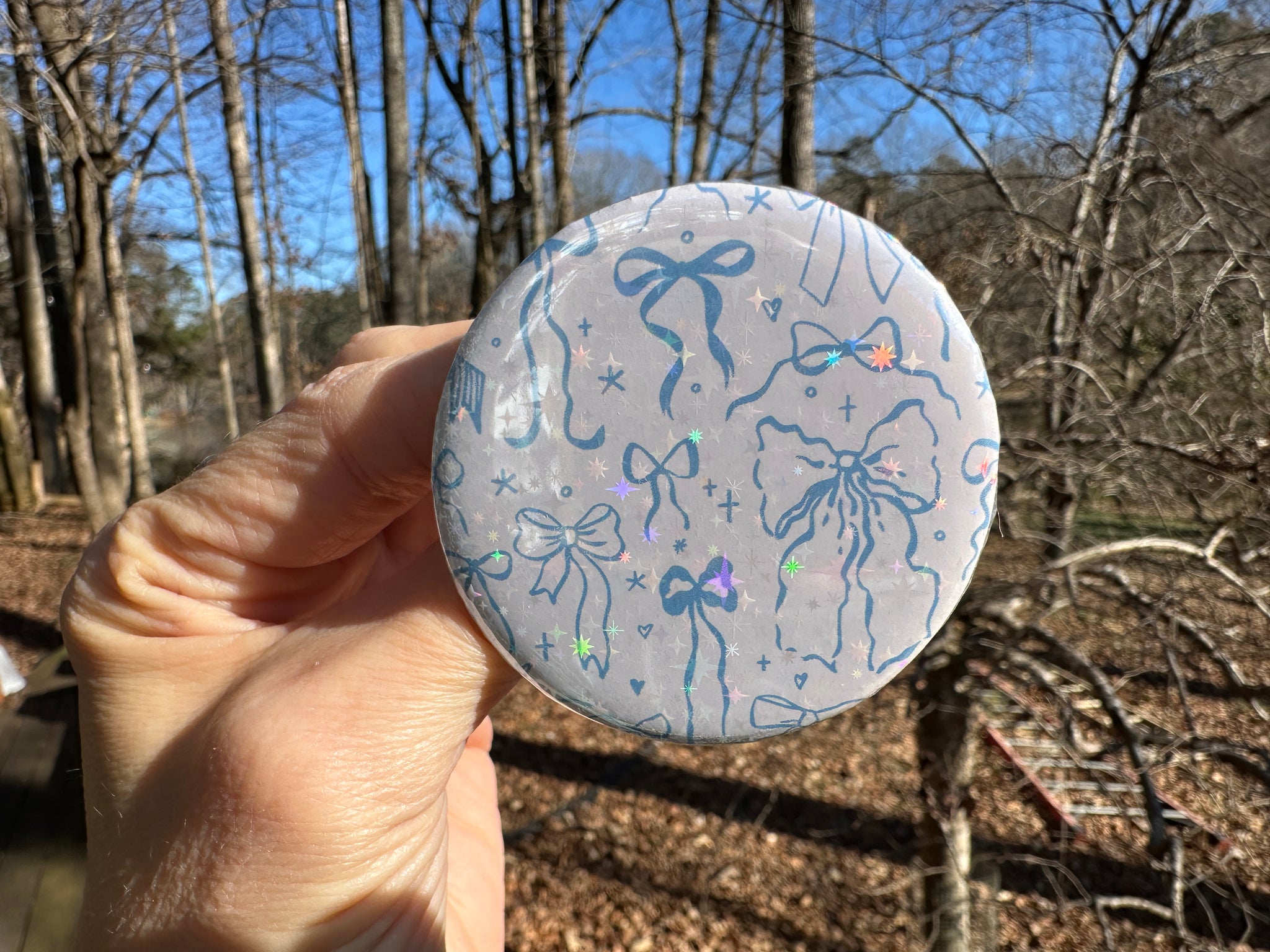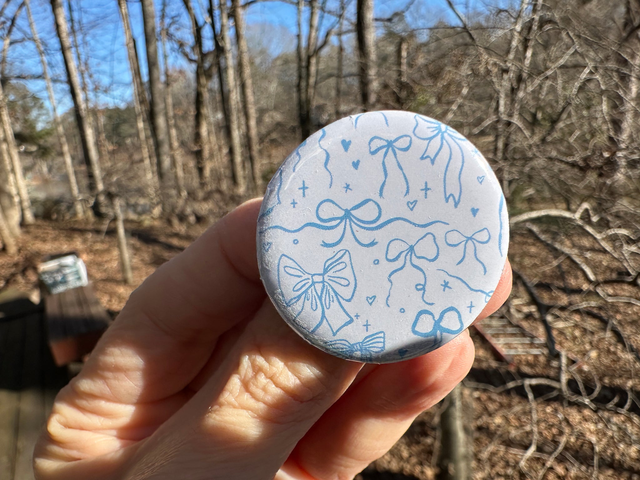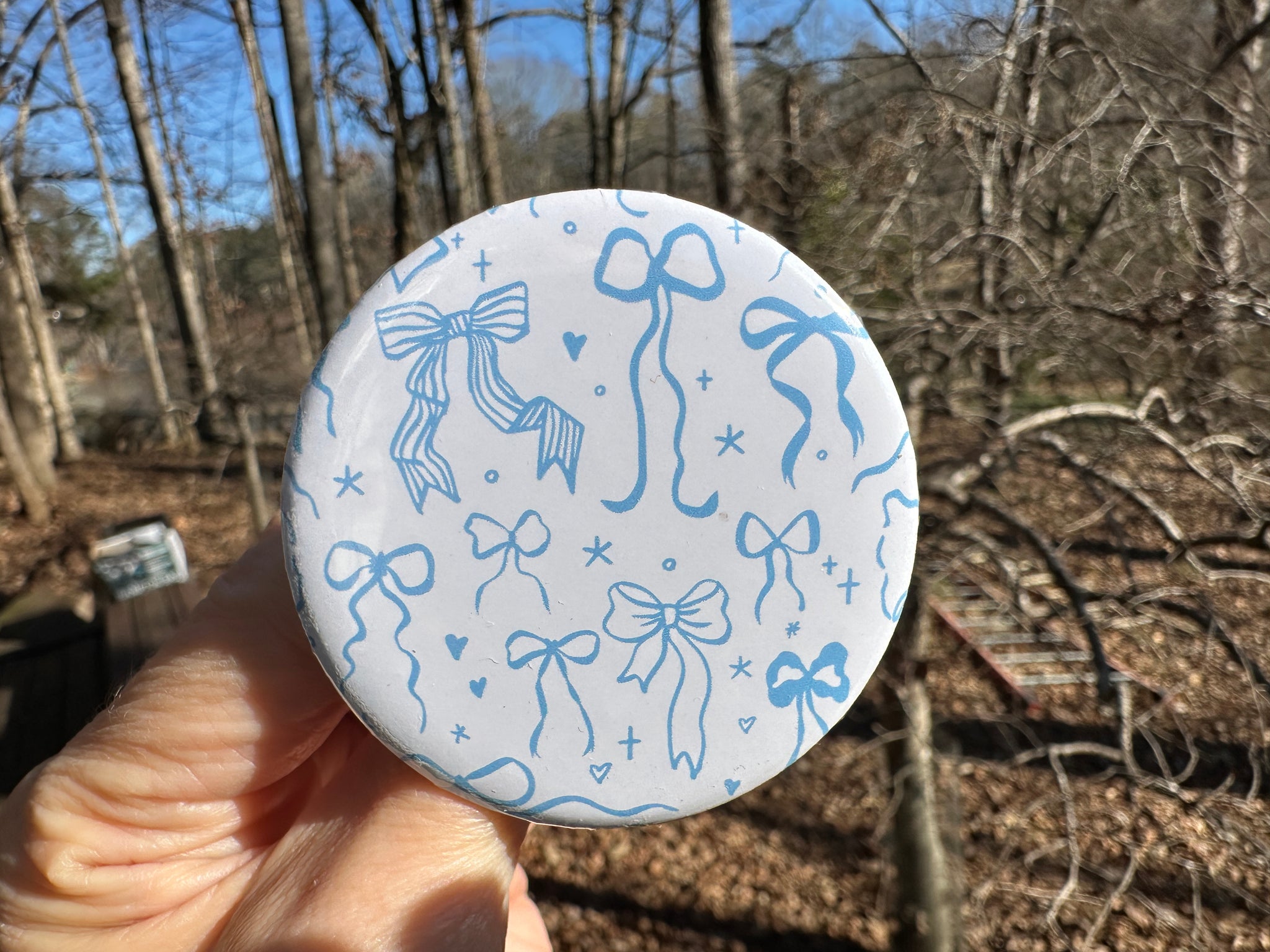 Pin Back Button Light Blue Coquette Bows Pattern
