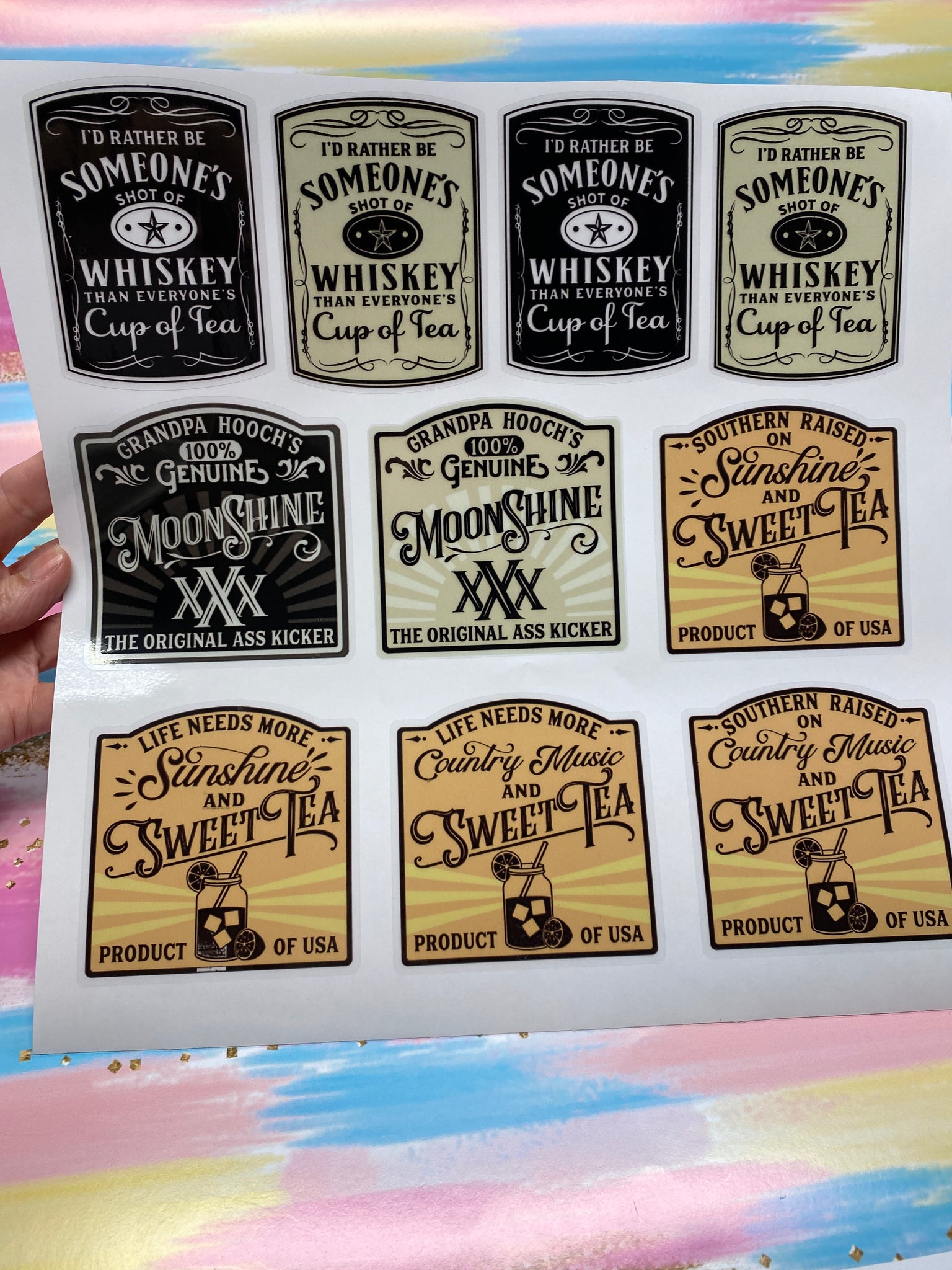 This sticker sheet is a full sheet. Stickers printed and contour cut on a 12 x 12 inch sheet. There are 9 stickers on this sheet. Each are approximately 3 1/2 inches tall and no wider than 4 inches.