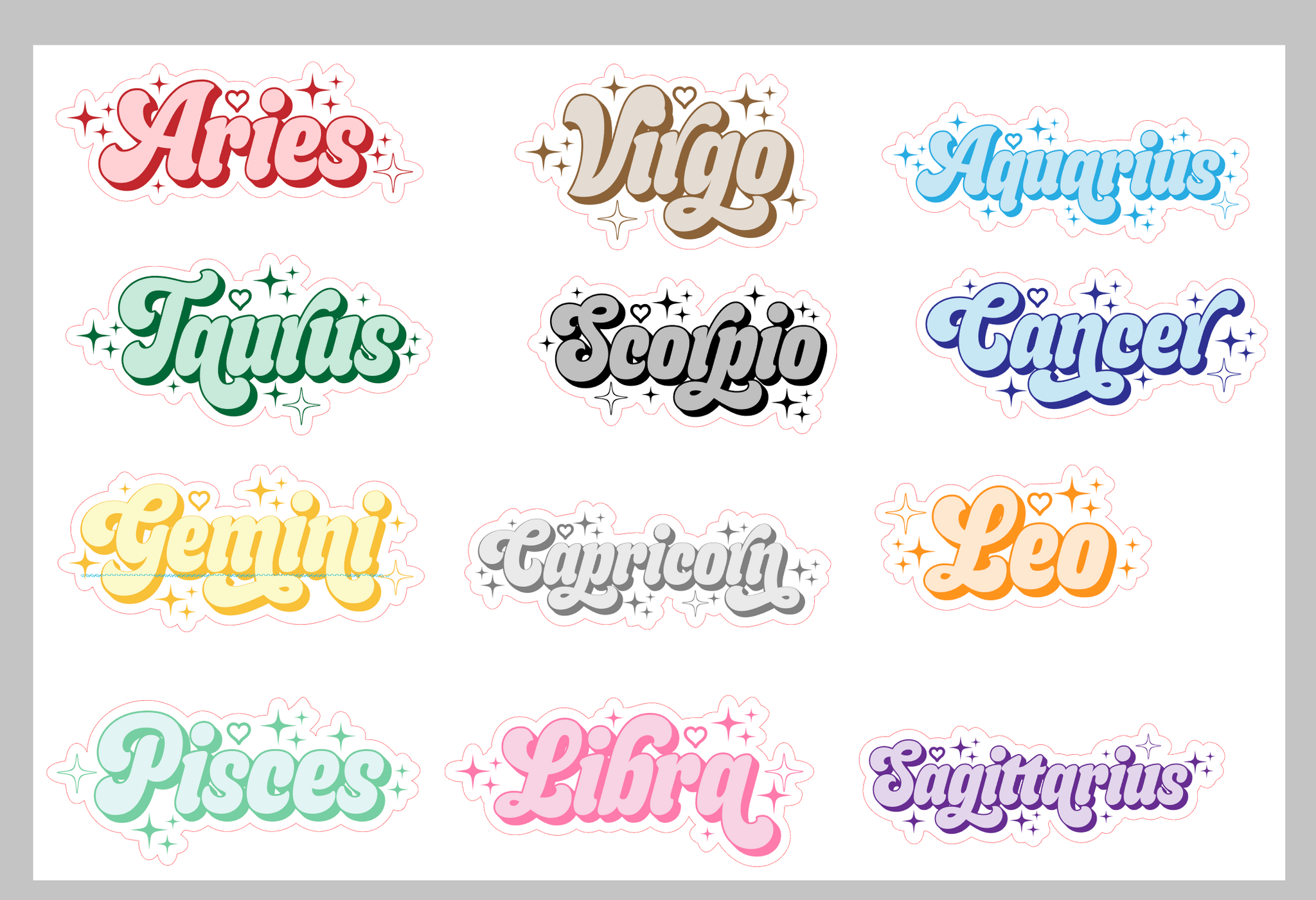 Sticker Sheet | Set of little Fancy Zodiac Names planner stickers 5 X 7