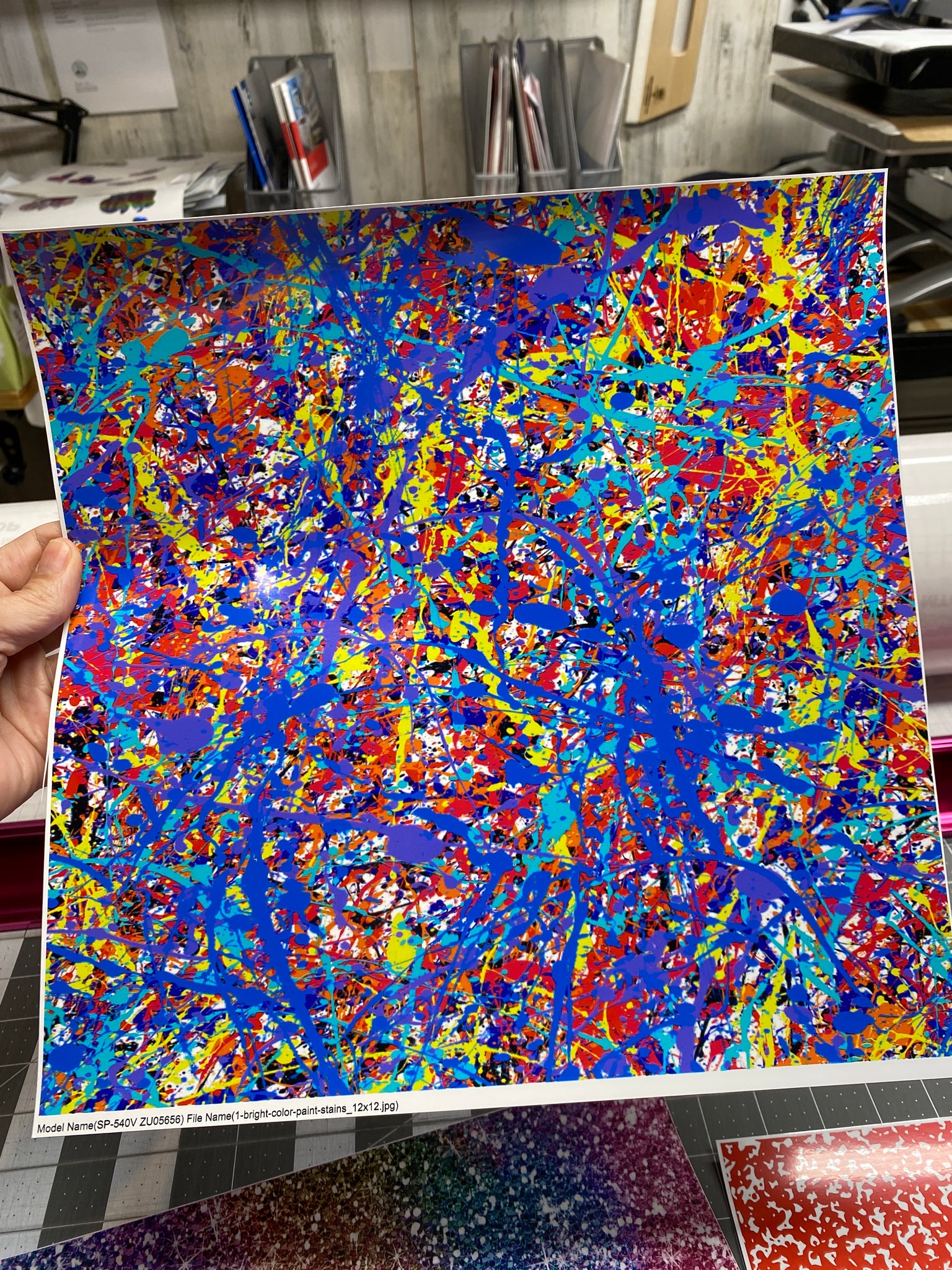 printed on a Roland commercial printer using waterproof, eco-solvent inks (not tested with epoxy or other chemicals, request a complimentary scrap if you need to test it).